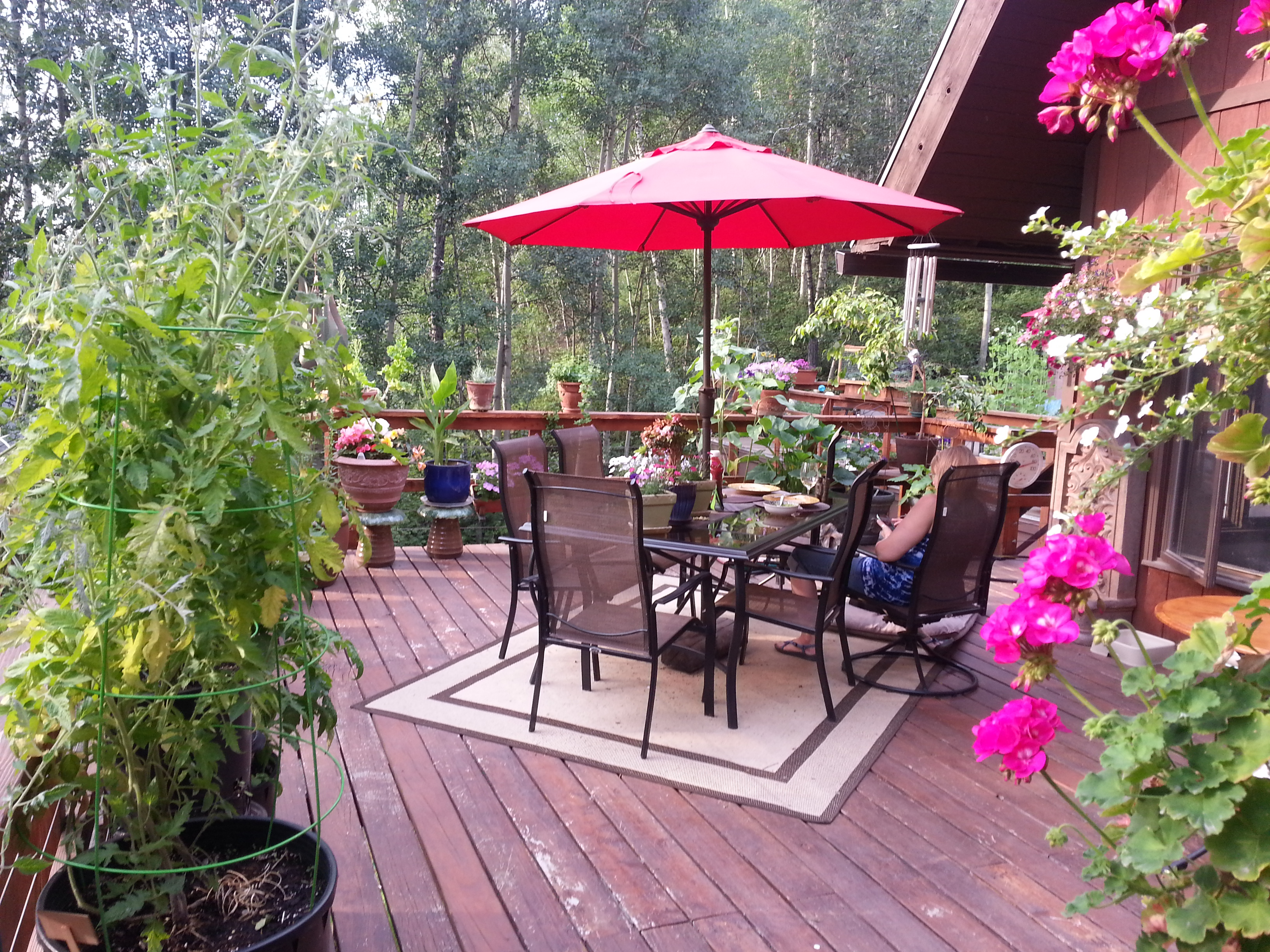 Because of the long periods of time we’re forced to stay indoors, we make the most of our outdoor space for the time that we have it. wpid-20150704_202213.jpgwpid-20150614_142137.jpgWe have a huge deck and it is inevitably a perfusion of plants – flowers and edibles – and comfortable places to sit and enjoy the almost continual sunshine. Just as the darkness reigns in the winter, our summers are sunny day and night. One often has to remind oneself to go to bed because this is truly the land of the midnight sun. Room darkening blinds help create a sort of twilight in the house that allows us to get a good night’s sleep no matter when the sun decides to set. We rarely have 90 degree days, though there are several in the 80’s, and if it’s too warm in the loft for sleeping, we have a nice, cool basement for that.