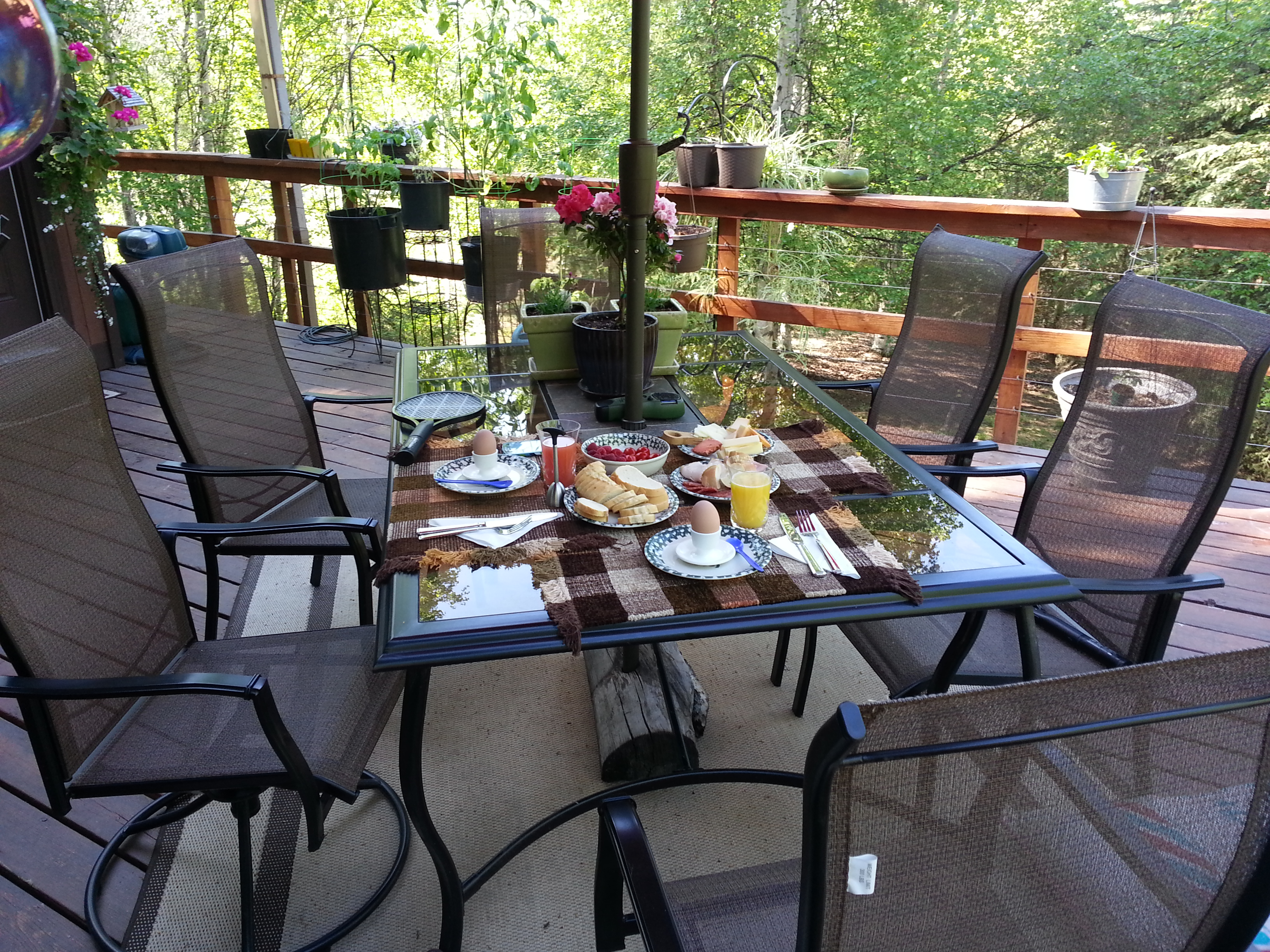 In the Summer, we try to have as many of our meals on the deck as we can, including brunches – when the weather cooperates, that is. In the winter we often crowd out the orchids and squeeze into the greenhouse among the plants, enjoying our little oasis in the midst of Alaska’s Arctic Steppe. Regardless of the locale, for us it’s about a little time apart from the world that is just ours.