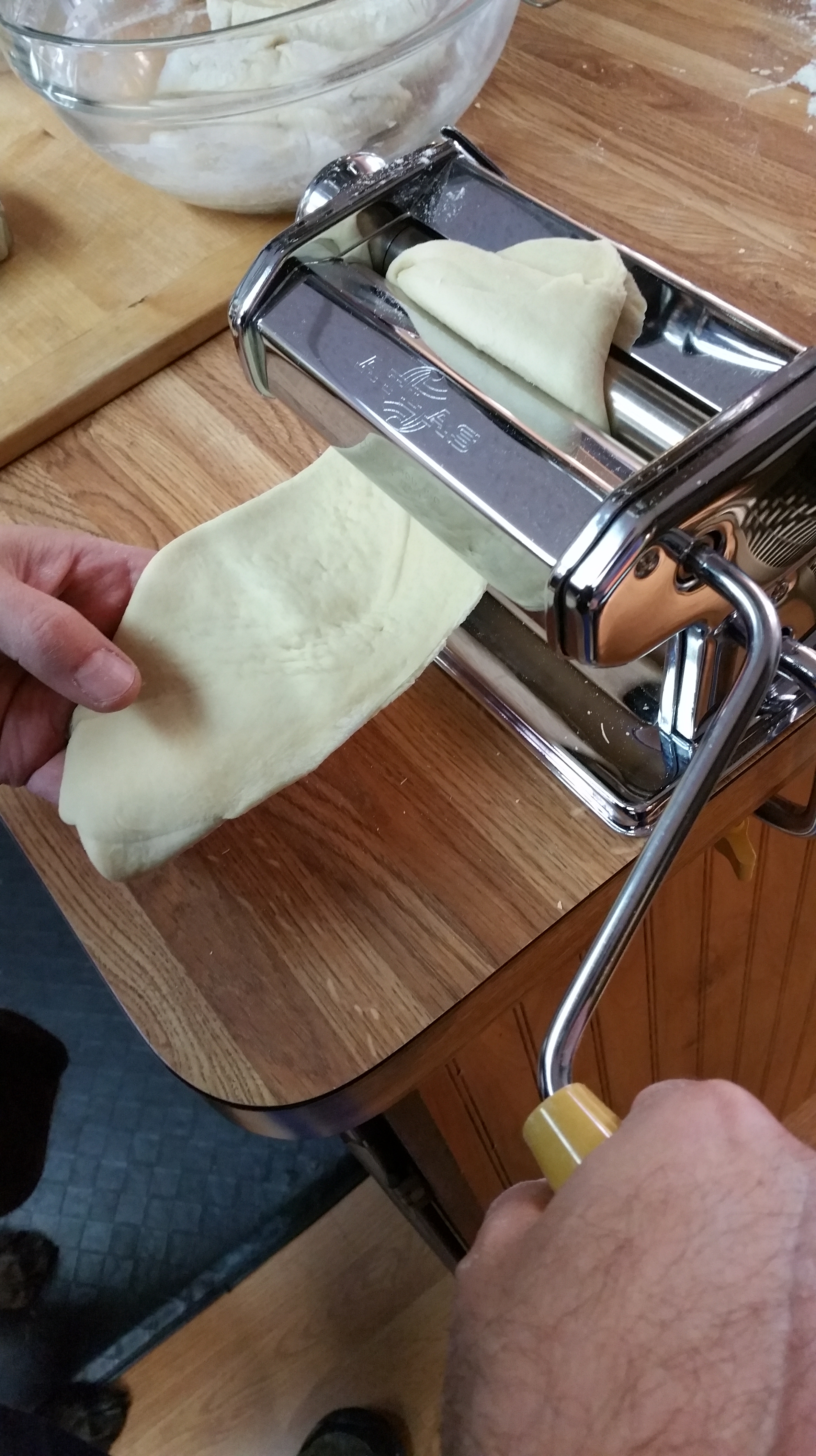 When using a pasta machine, you need to start with the widest setting (1) and process the dough at that setting several times, folding it double or even triple before putting it back through the machine. We often have to add a dusting of flour every other time, just to give you an idea of how the flour additions work. After several runs through at a (1) you can decrease to (2), though we usually skip to (3) and then to (5) without any catastrophic failures.